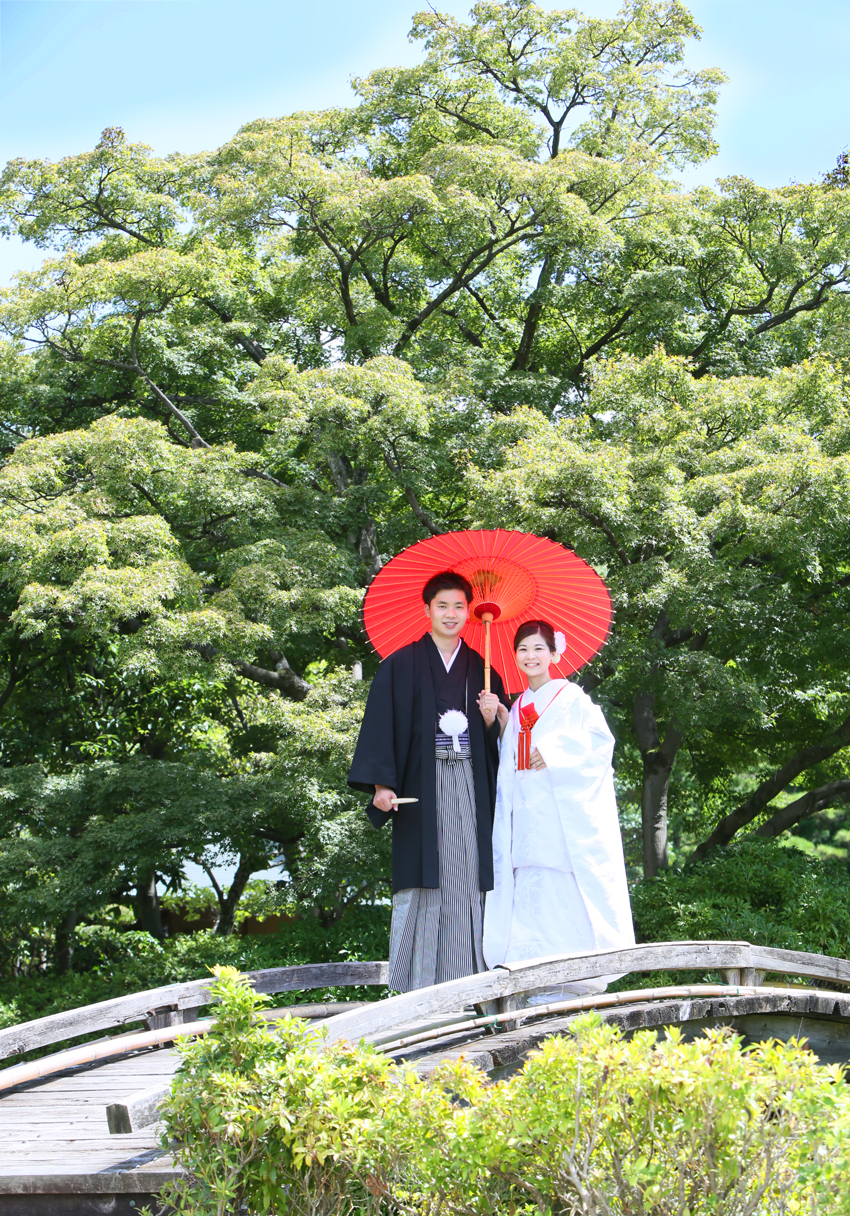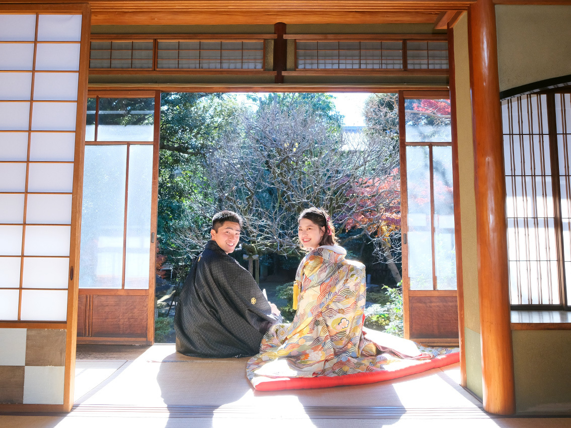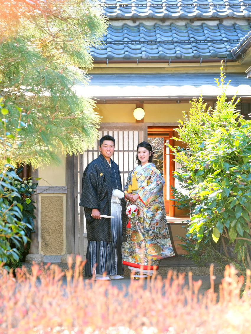 広大な敷地を持つ大きな公園に、春は「梅」「桜」「ハナミズキ」「椿」「紫陽花」、秋は「銀杏」「紅葉」など季節ごとに彩る草木がありお二人をお迎えします。和装のウェディングフォトにはお茶室の日本庭園もおすすめです。