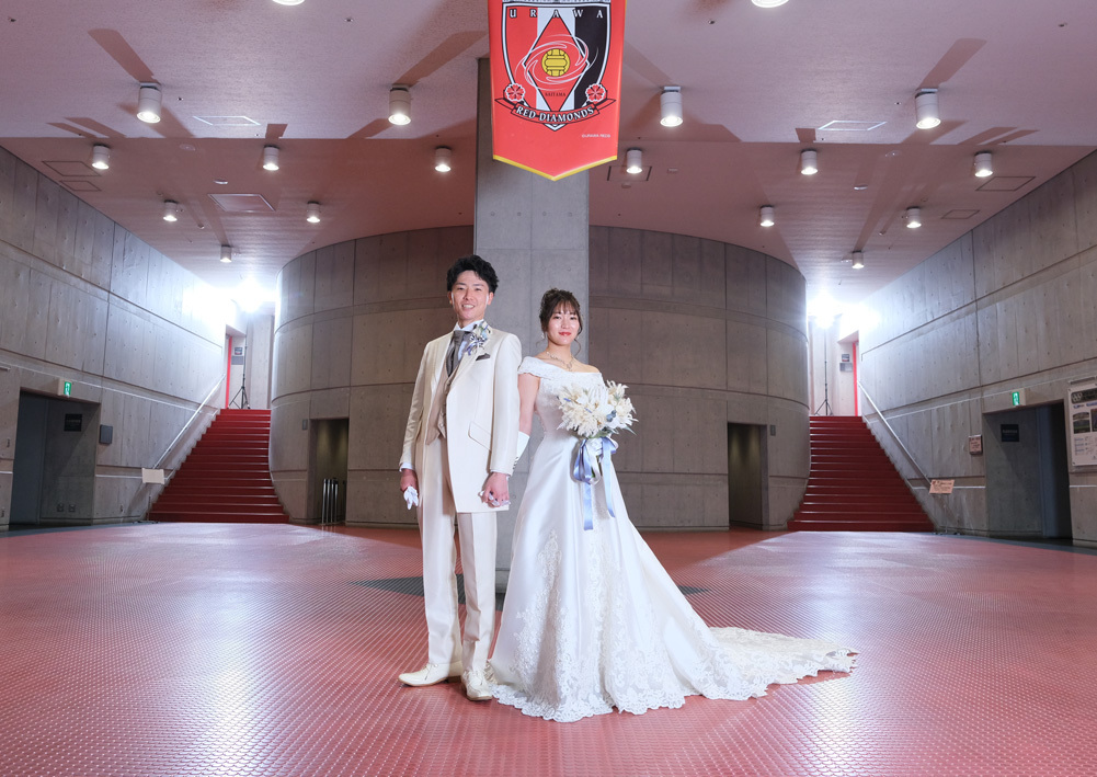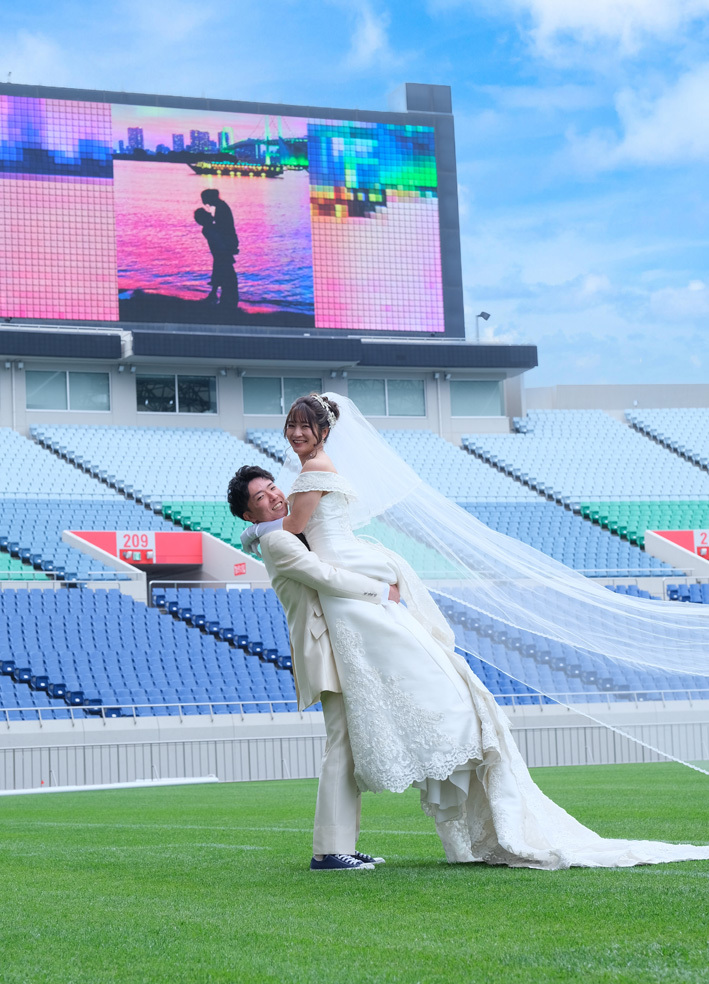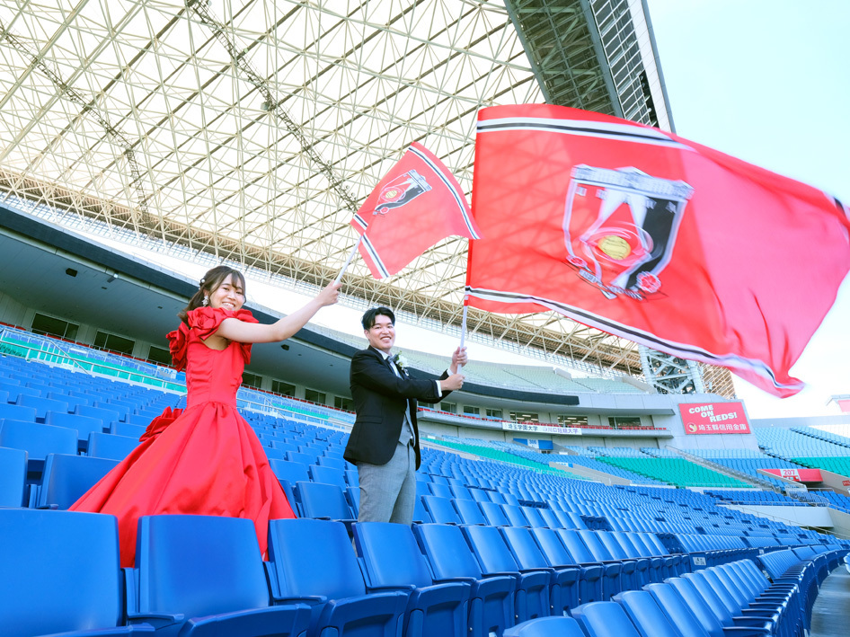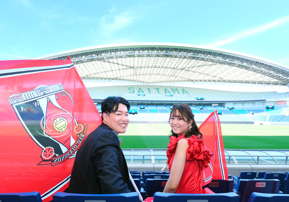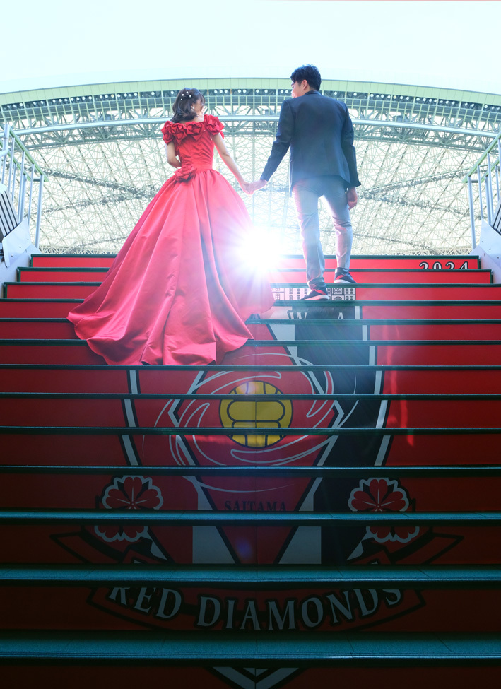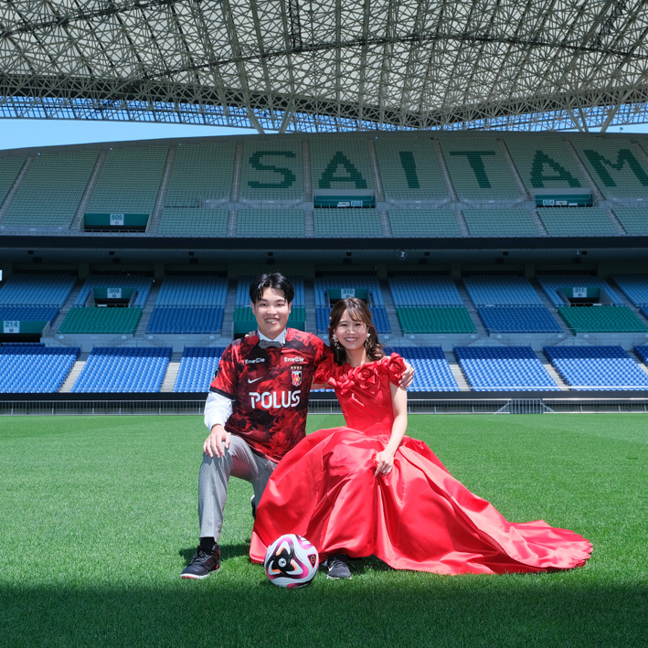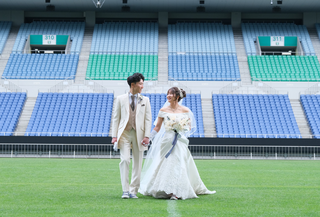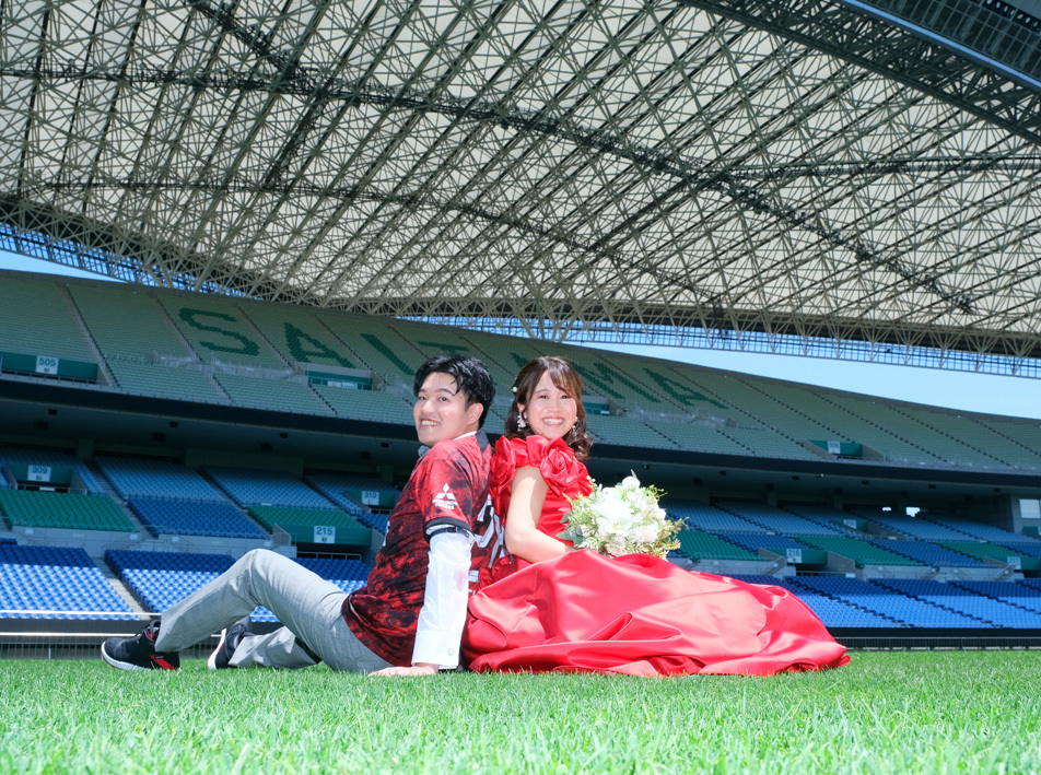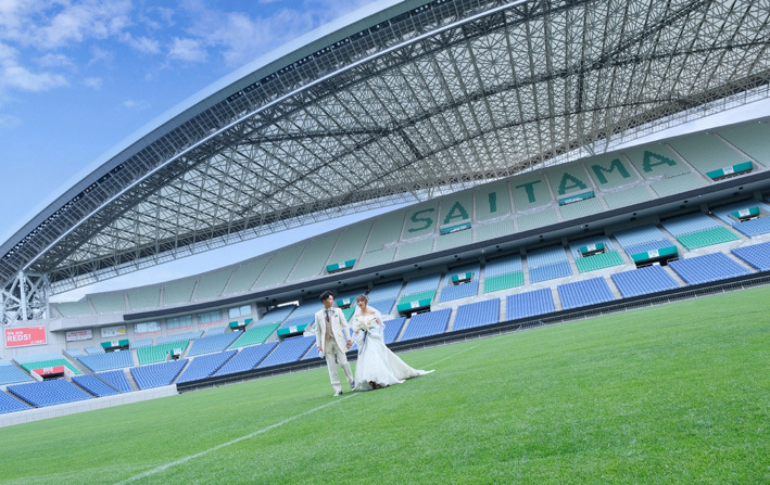 アジア最大級のサッカー場「埼玉スタジアム2002」でのウエディングフォト。多灯ストロボライティングでウエディングを楽しく、ドラマチックに演出します。<おすすめシーズン:年間通じて>