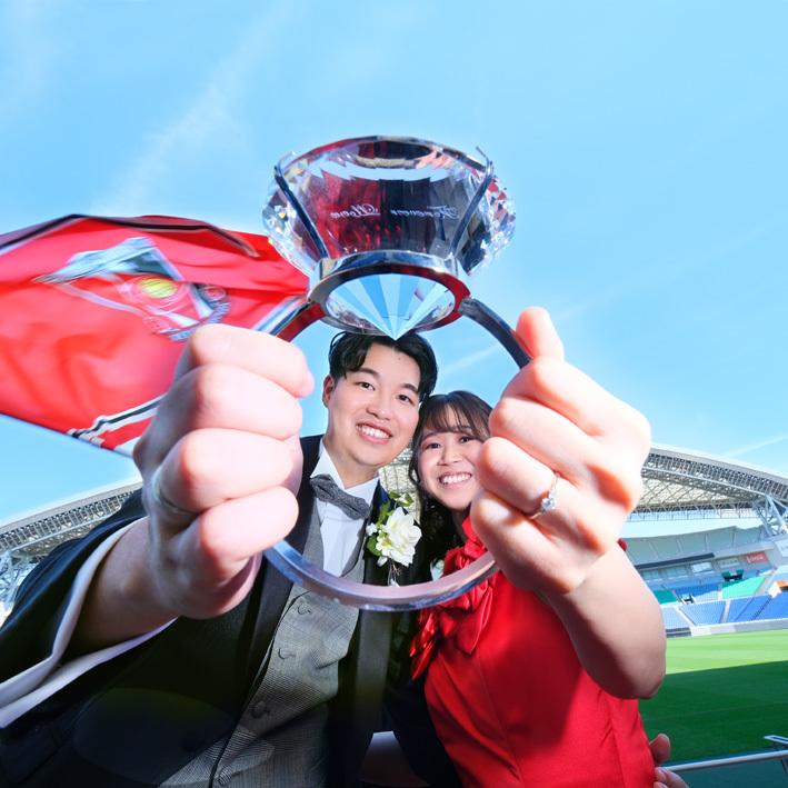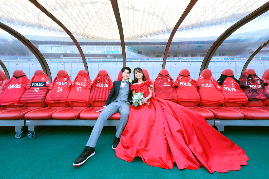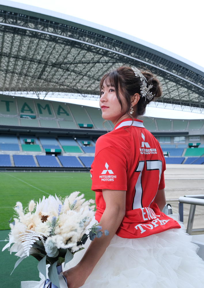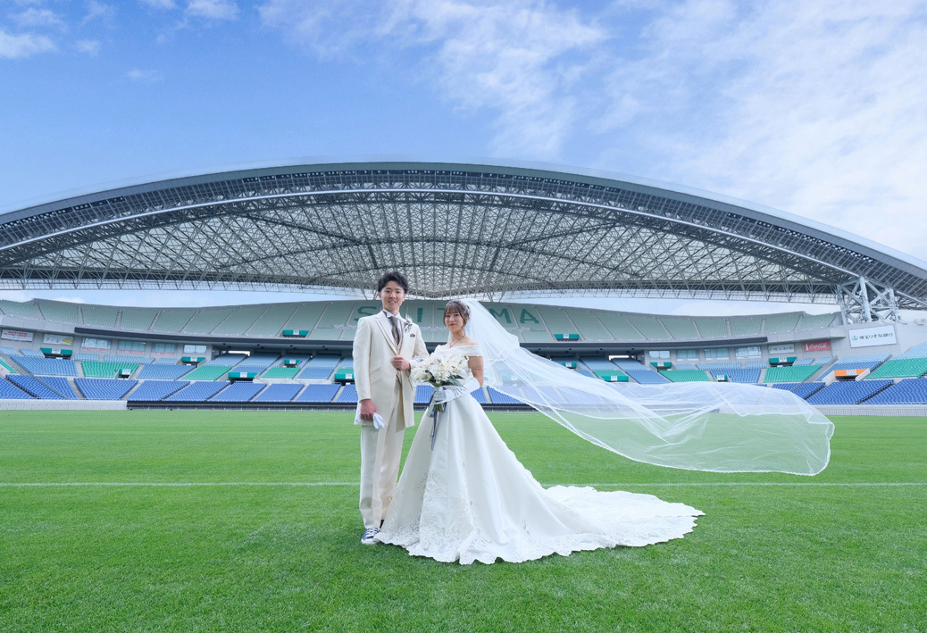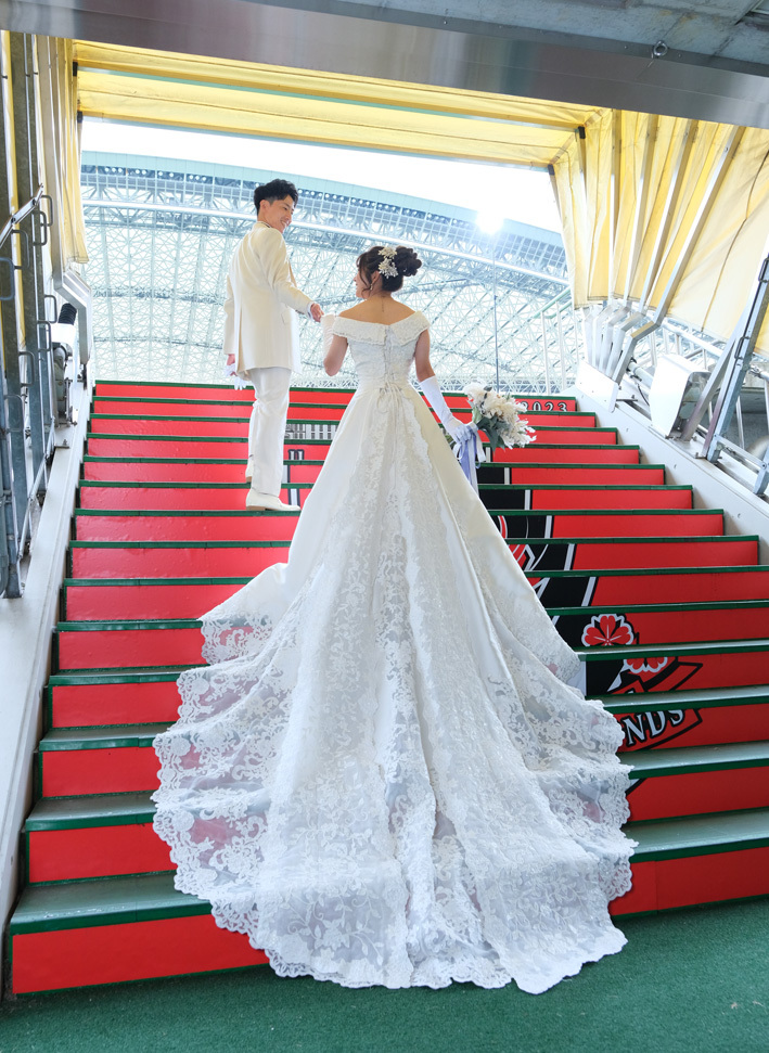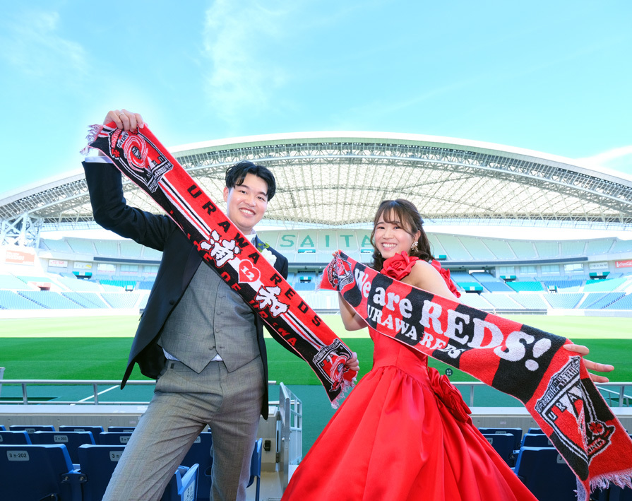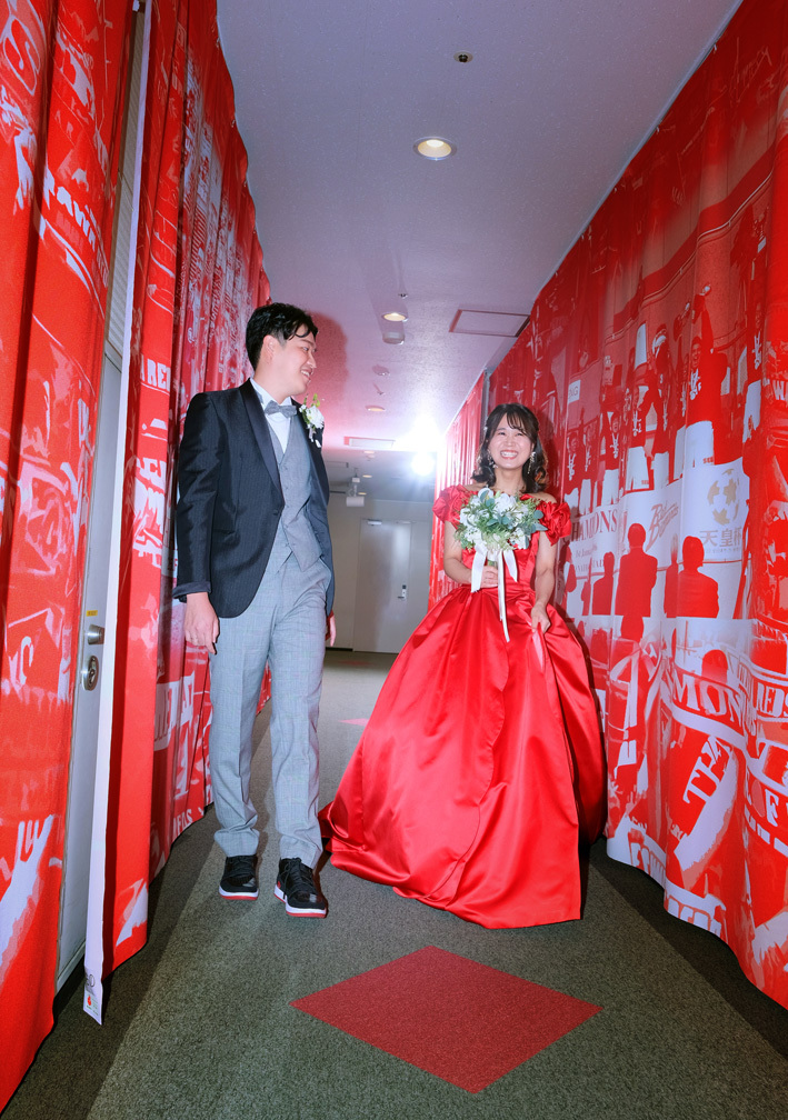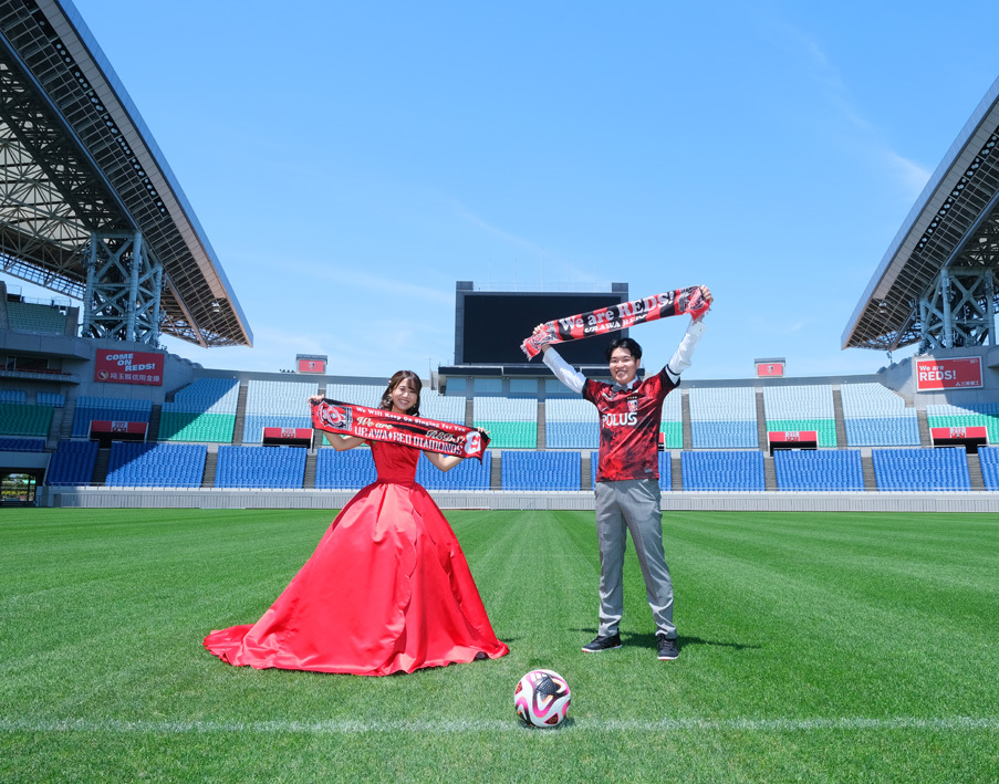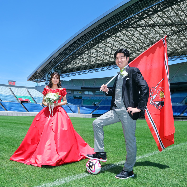 アジア最大級のサッカー場「埼玉スタジアム2002」でのウエディングフォト。多灯ストロボライティングでウエディングを楽しく、ドラマチックに演出します。<おすすめシーズン:年間通じて>