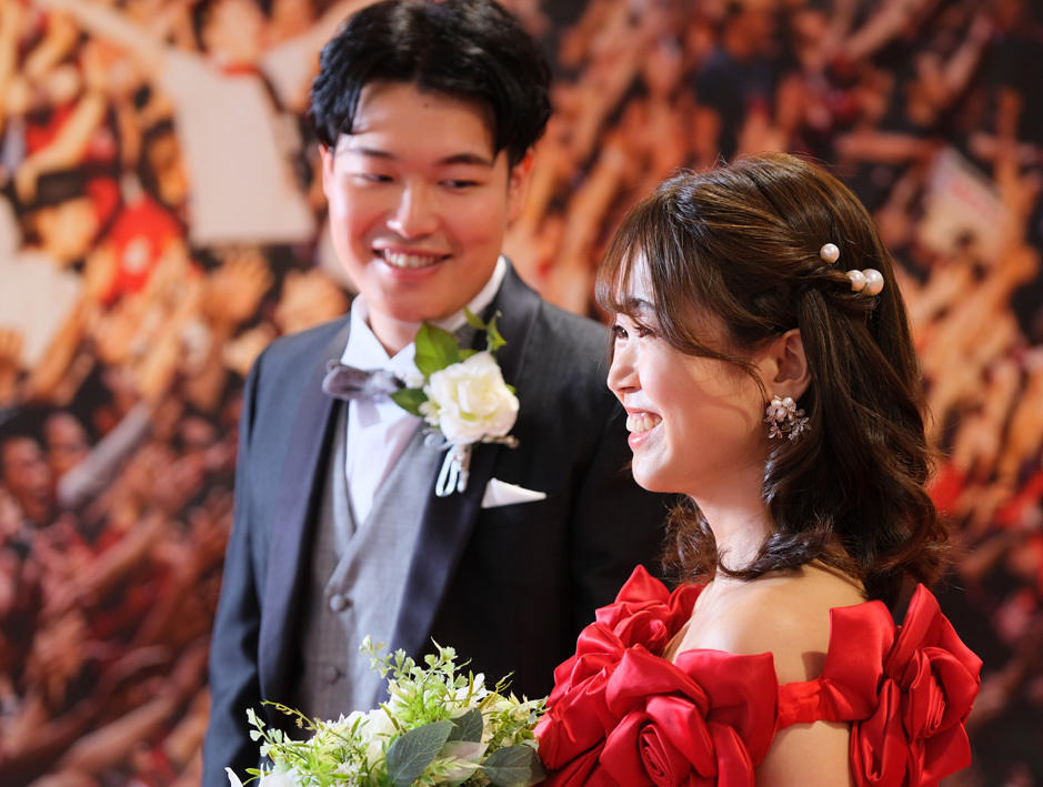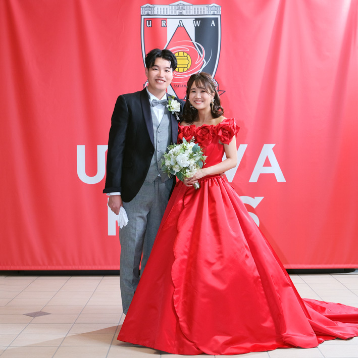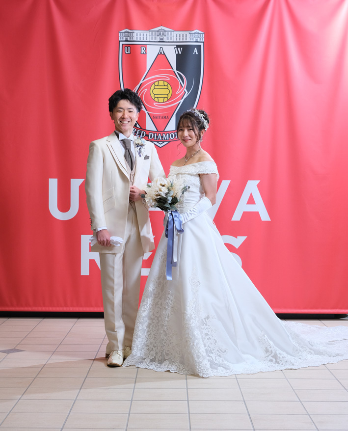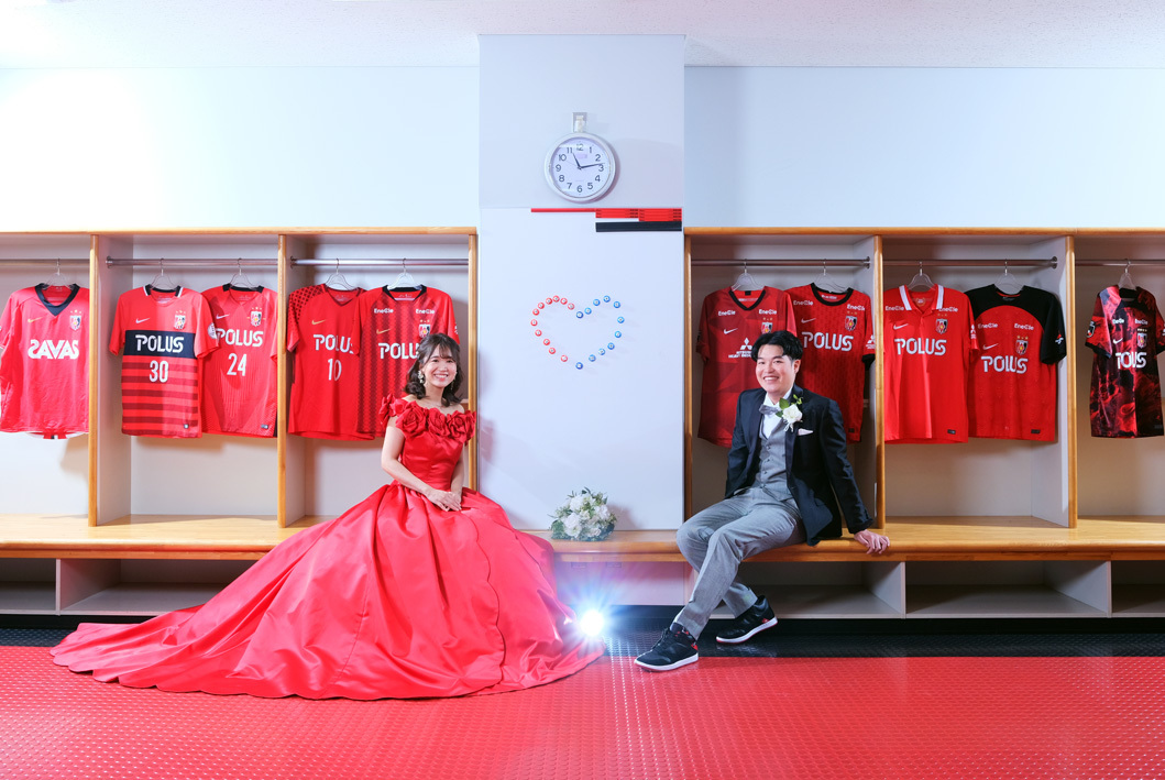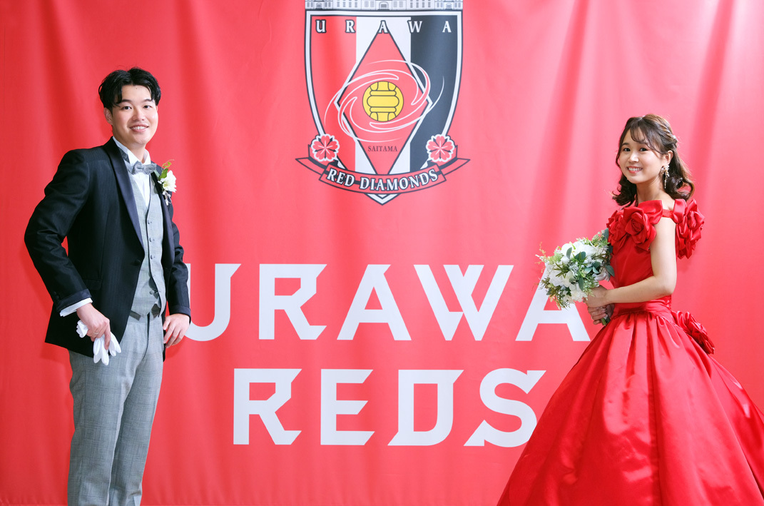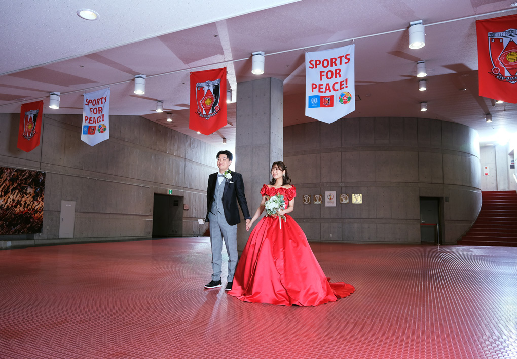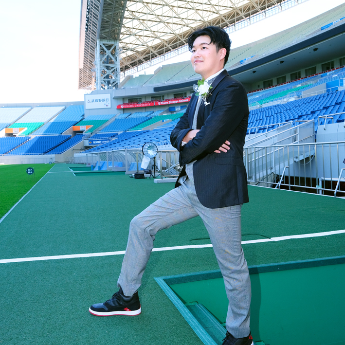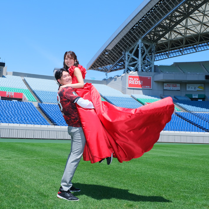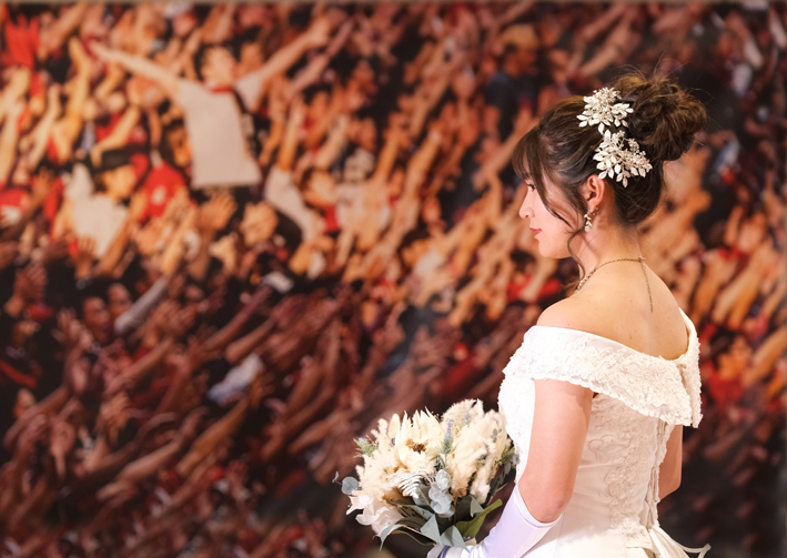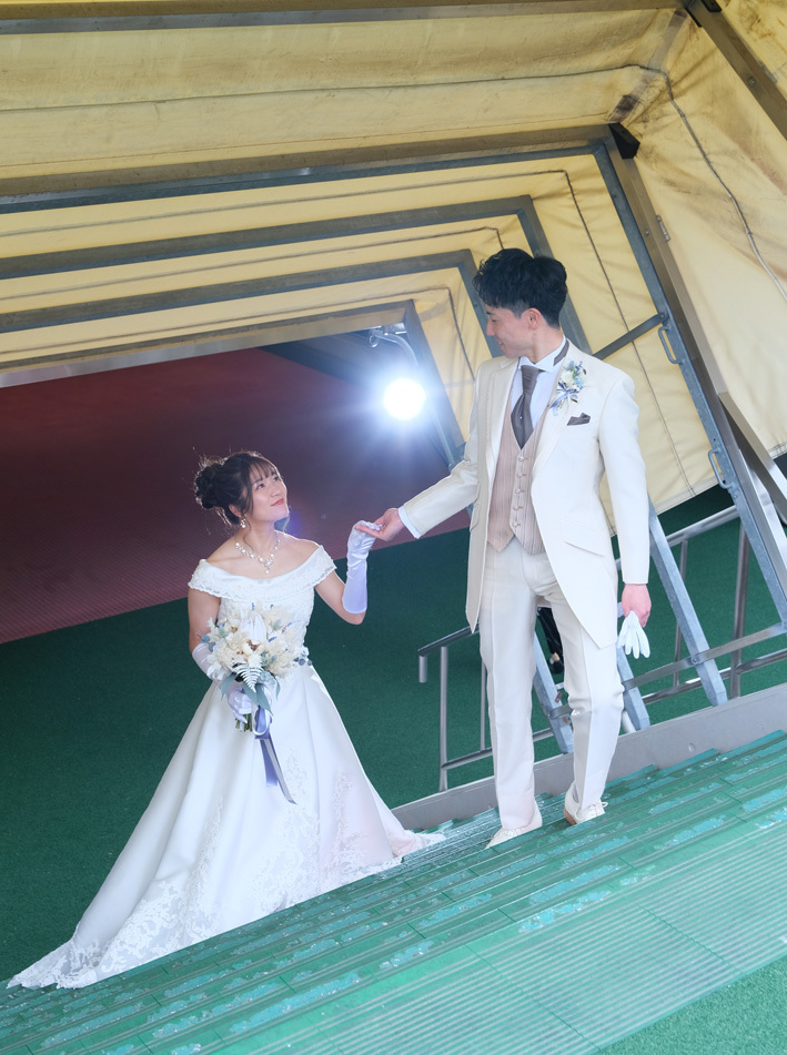 アジア最大級のサッカー場「埼玉スタジアム2002」でのウエディングフォト。多灯ストロボライティングでウエディングを楽しく、ドラマチックに演出します。<おすすめシーズン:年間通じて>