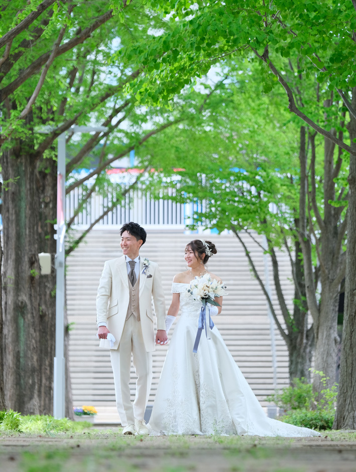 たくさんドレスがあるのに、ドレスの追加料金がなくて、アクセサリーなどの小物類の料金がコースに含まれているので、とても親切だと思いました。私は151㎝なので、ヒールの高い靴で180㎝の旦那さんとの身長のバランスをとってもらいました。旦那さんの衣装が入るか心配でしたが、いくつか選べたのでホッとしました。撮影の移動中は靴を変えてもらったので、思っていたよりも足が痛くならなかったです。